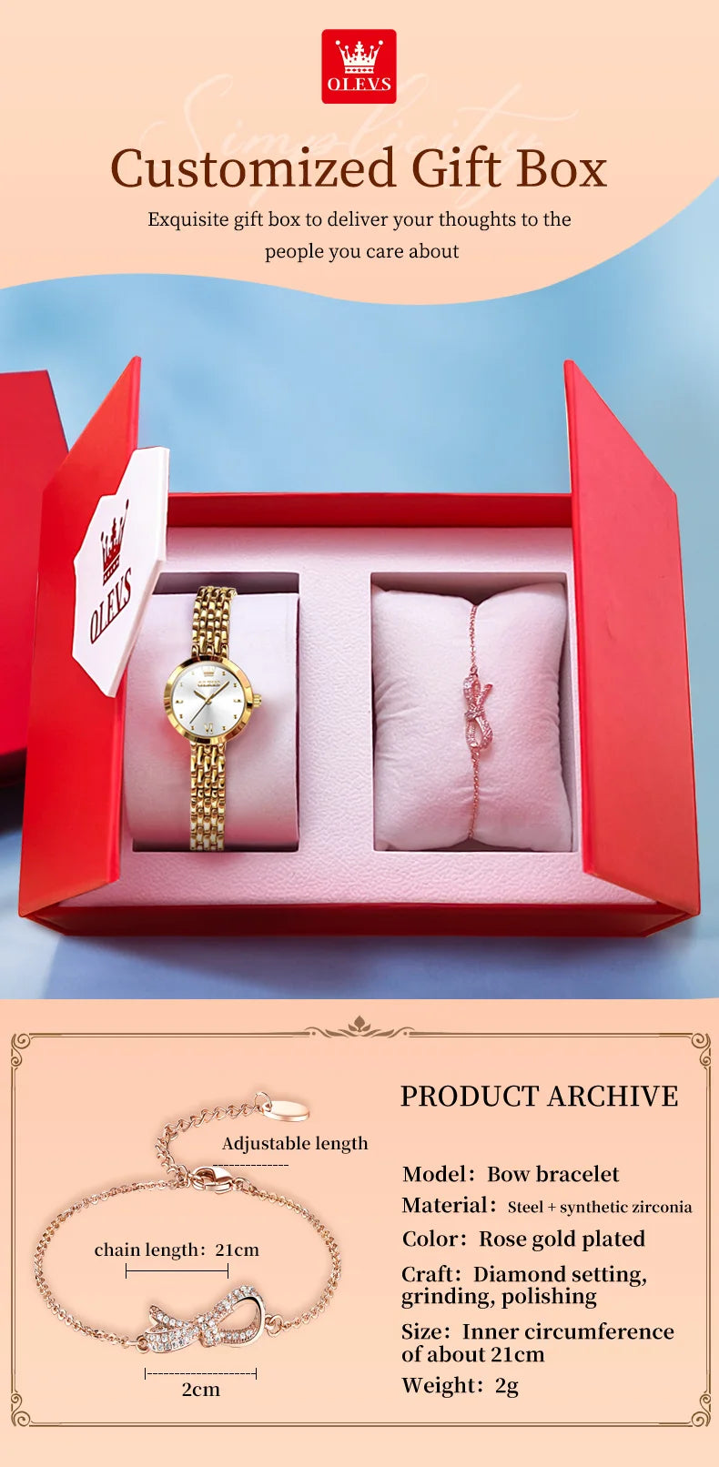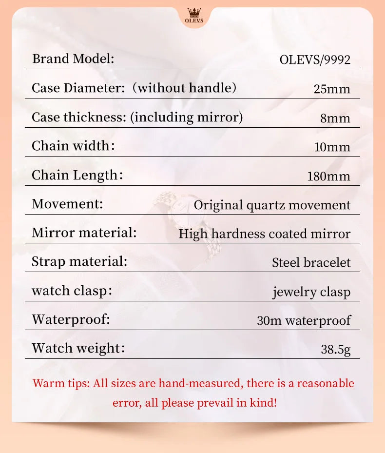 This OLEVS quartz watch combines refined elegance with practical durability. The 25mm round stainless steel case features a hardlex dial window and 8mm thickness for a sophisticated profile. An 18-inch stainless steel band with secure folding clasp ensures comfortable, reliable wear. Water-resistant to 3 bar, it handles daily moisture and swimming without compromise. The shock-resistant construction protects against everyday impacts, while the numberless dial maintains a clean, timeless aesthetic. Weighing just 38.5g, this fashion-forward timepiece delivers dependable performance for any occasion. CE certified for quality assurance.