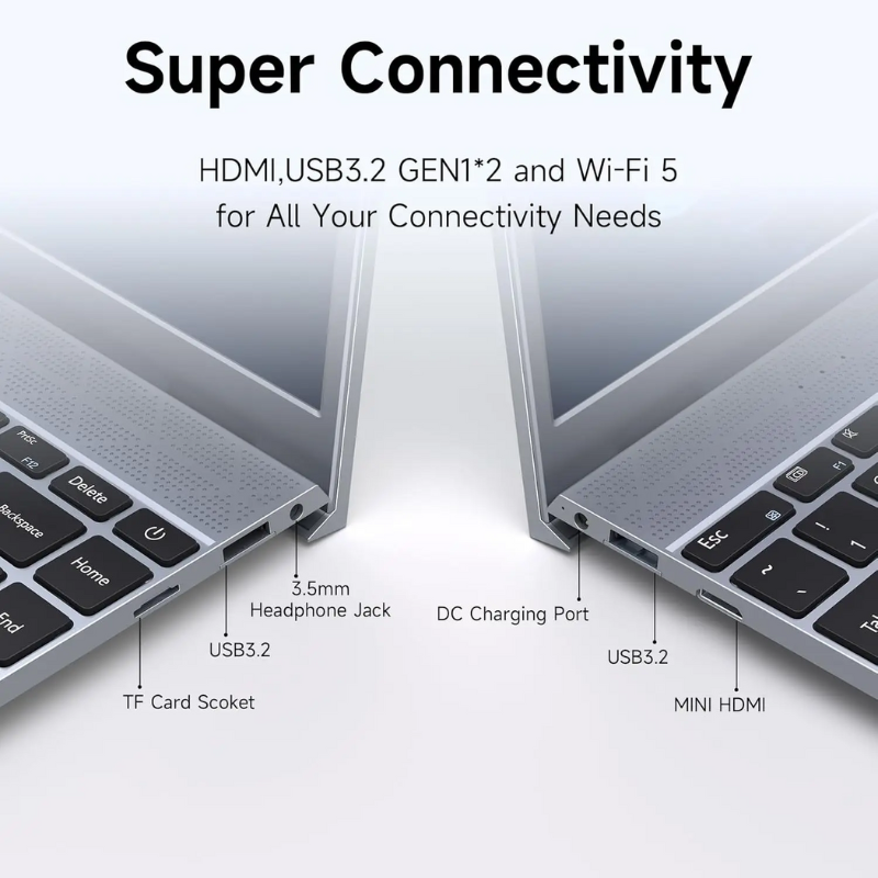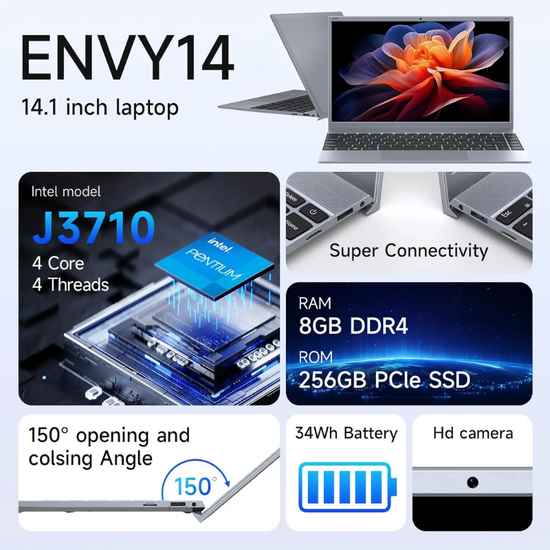 This 14-inch laptop features an Intel Pentium J3710 processor with 8 cores and speeds up to 2.60 GHz for efficient multitasking. Equipped with 8GB DDR4 RAM and a 256GB SSD, it offers fast performance and ample storage. The Full HD 1920x1080 display delivers clear visuals in a 16:9 aspect ratio. Running Windows 11, it includes integrated Intel graphics and a USB 3.1 Gen2 port. Its compact plastic body measures 324x211x15.9mm and provides up to 6 hours of battery life, making it a reliable choice for students and business users.