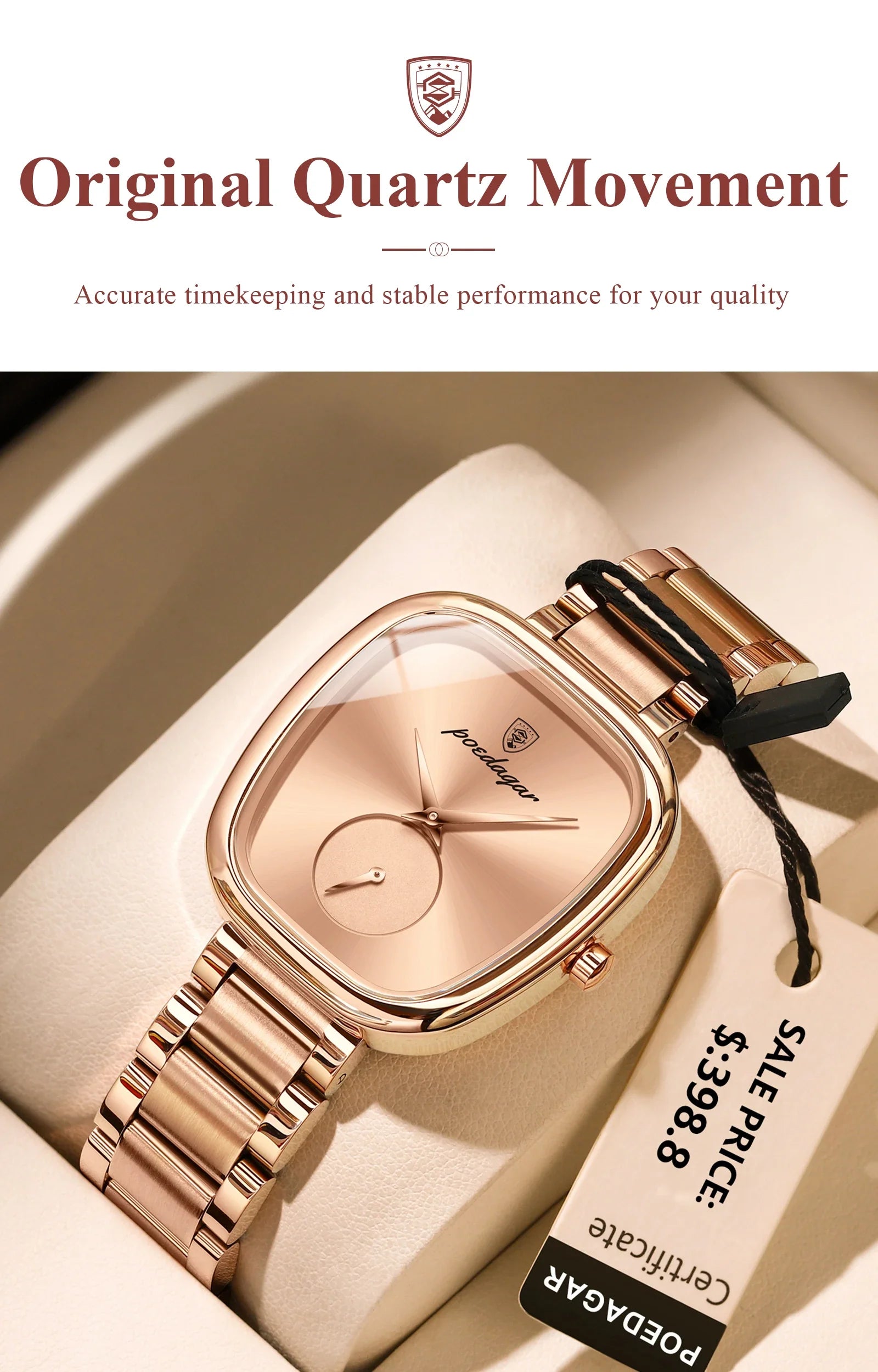 This POEDAGAR quartz watch combines refined elegance with practical durability. The 34mm stainless steel case features an irregular shape that sets it apart, while the hardlex crystal protects the numberless dial. A 16mm stainless steel band with secure push-button hidden clasp ensures comfortable all-day wear. Water-resistant to 3 bar, it handles swimming and daily water exposure with confidence. The quartz movement delivers reliable timekeeping, making this timepiece an ideal choice for those seeking a versatile fashion watch that doesn't compromise on quality or style.